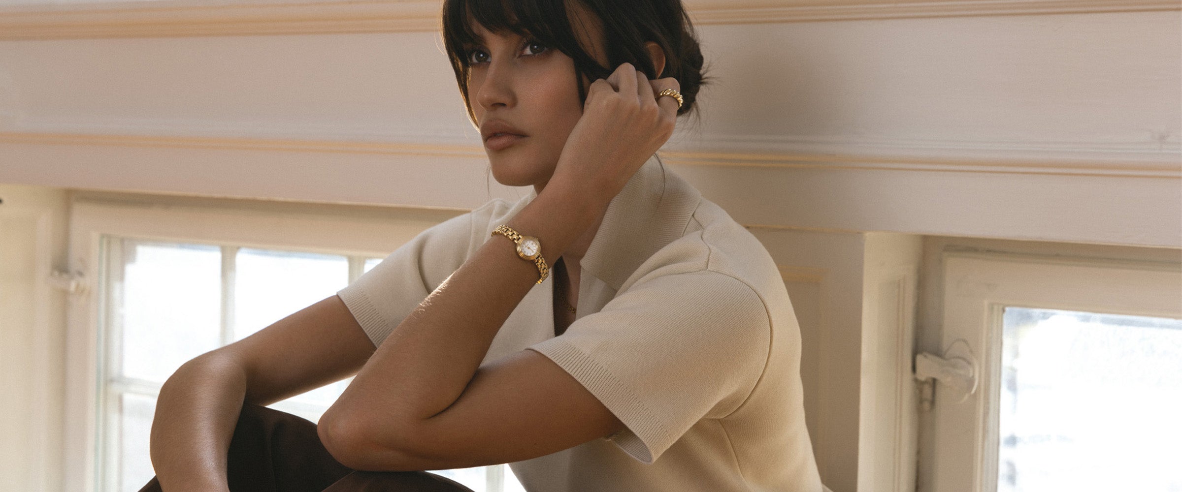 Käytä kultakoruja ja -kelloja, jotka korostavat lämpimiä ruskean sävyjä hienovaraisella eleganssilla. Seuraa kauden trendejä ajattomilla malleilla ja huolellisesti viimeistellyillä yksityiskohdilla – täydellinen sekä rennolle päivälle että erityiseen iltaan.