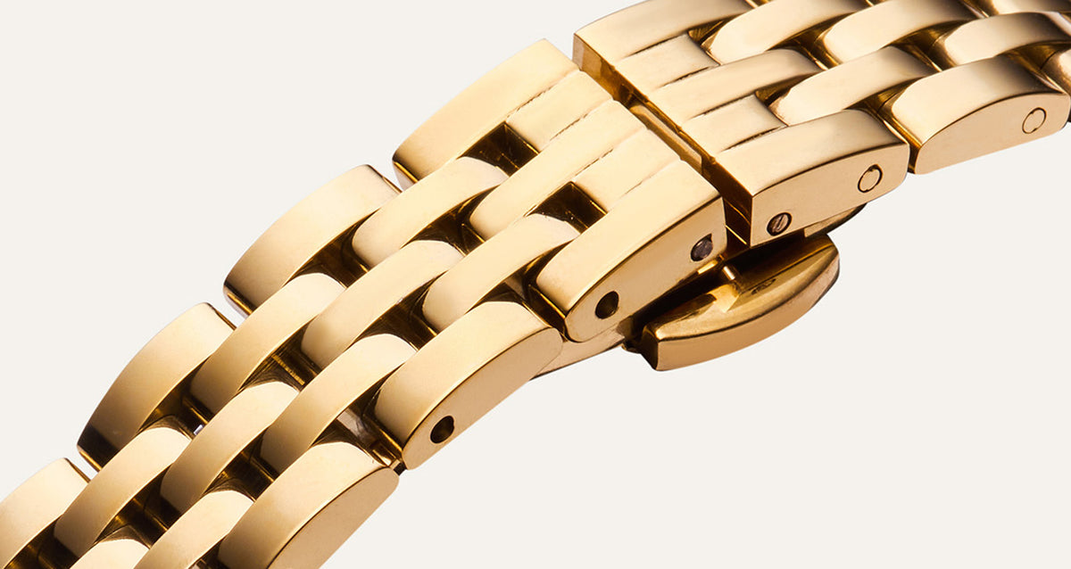 Vaihdettavat metallirannekkeet kelloihimme. Valitse ruostumattomasta teräksestä valmistettu ranneke hopean, kullan tai kaksivärisenä.