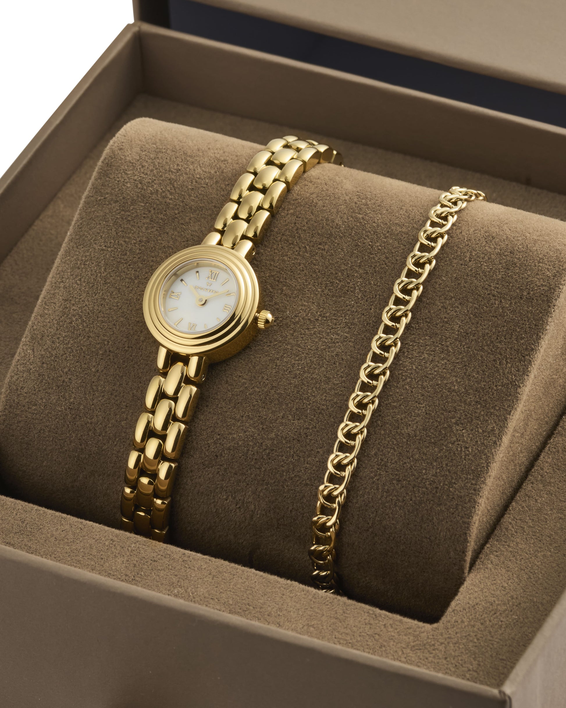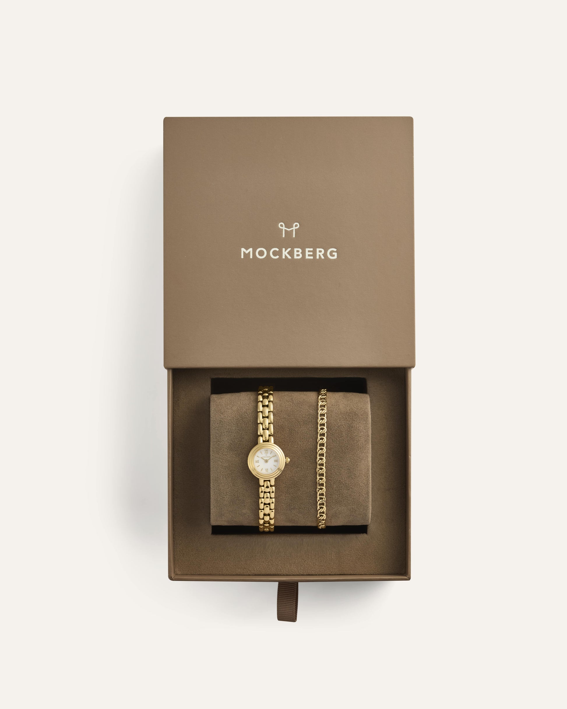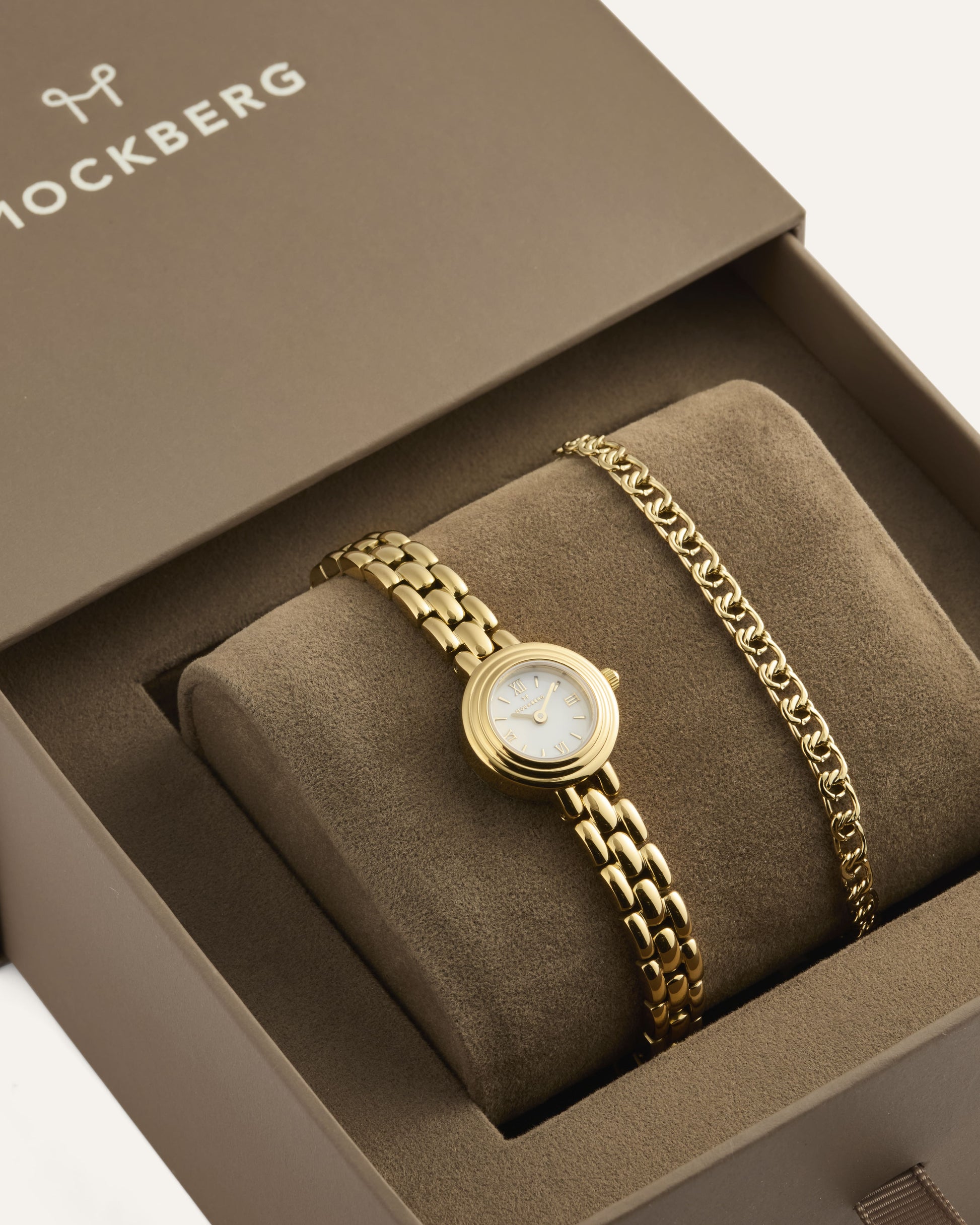 Mockberg’s gift set with the Antique watch and bracelet delivers a classic, cohesive look that suits both everyday wear and festive occasions. The combination is easy to style and enhances your outfit without being overpowering. The watch and bracelet are delivered together in a gift box.