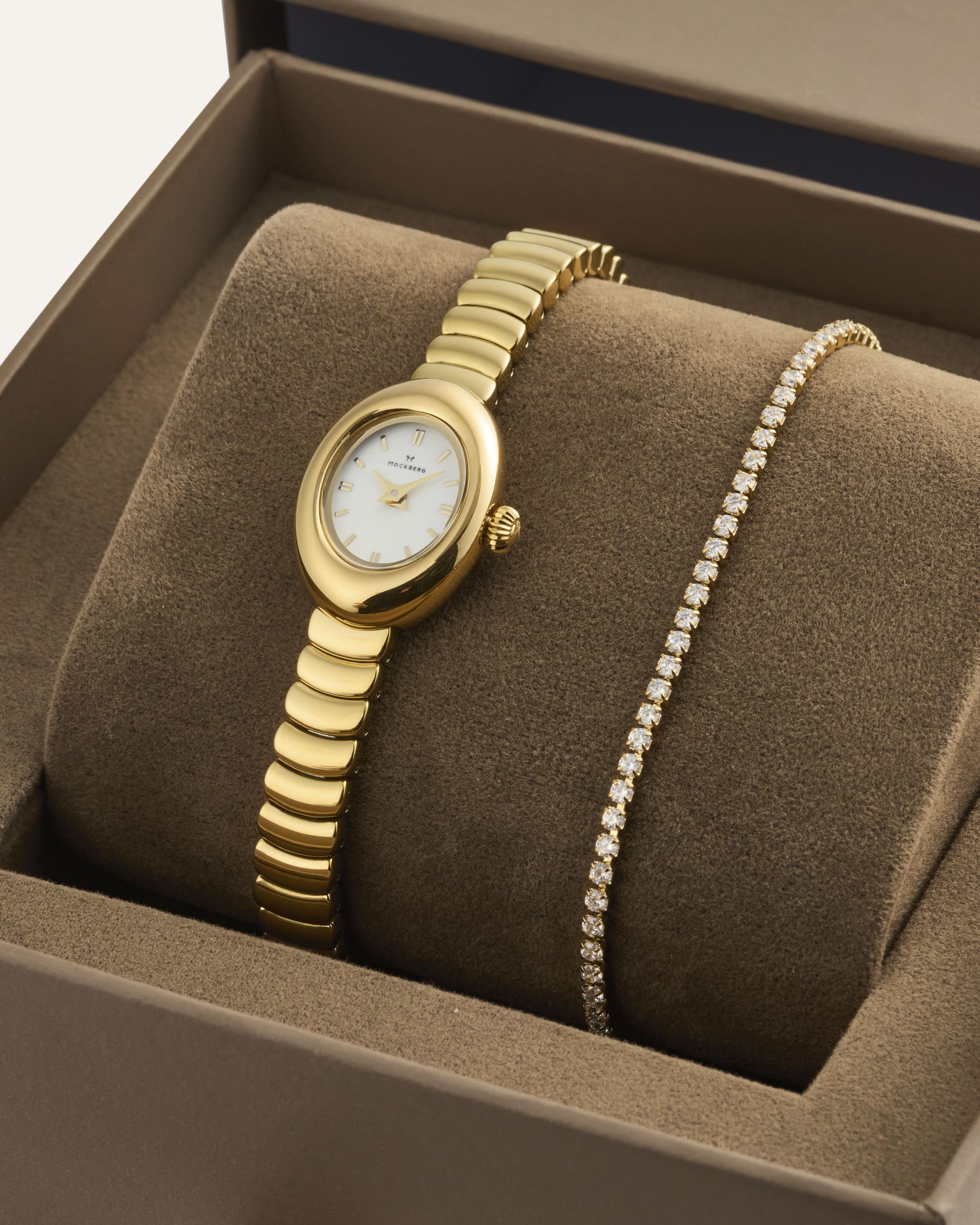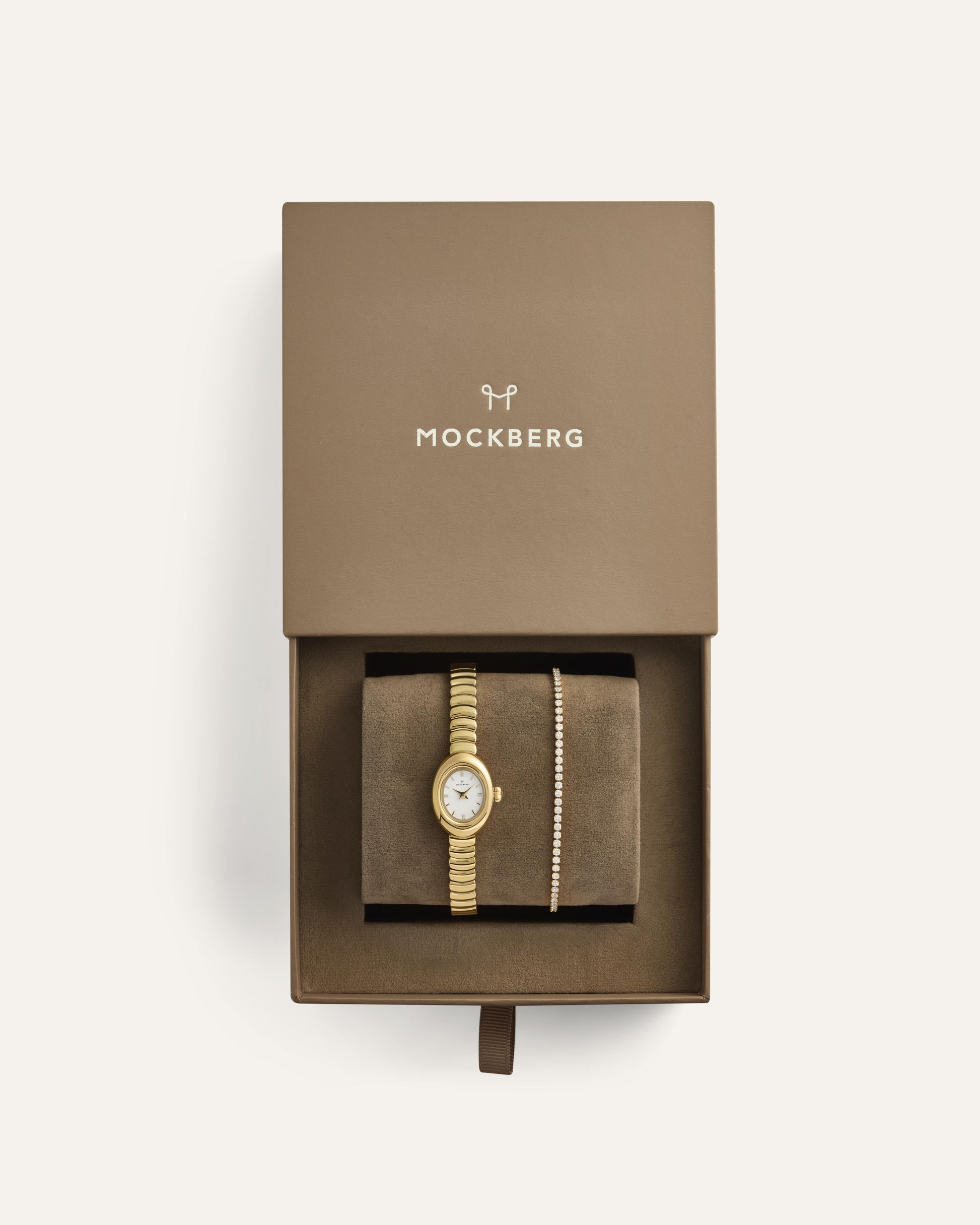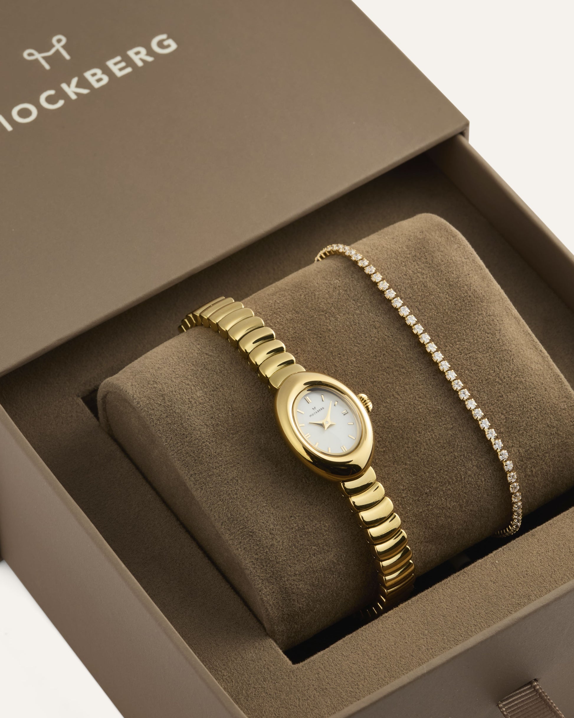 Mockberg’s gift set with the Belle Oval Petite watch and bracelet delivers a classic, cohesive look that works beautifully for both everyday wear and special occasions. The combination is easy to wear and elevates your style without being overpowering. The watch and bracelet are delivered together in a gift box.