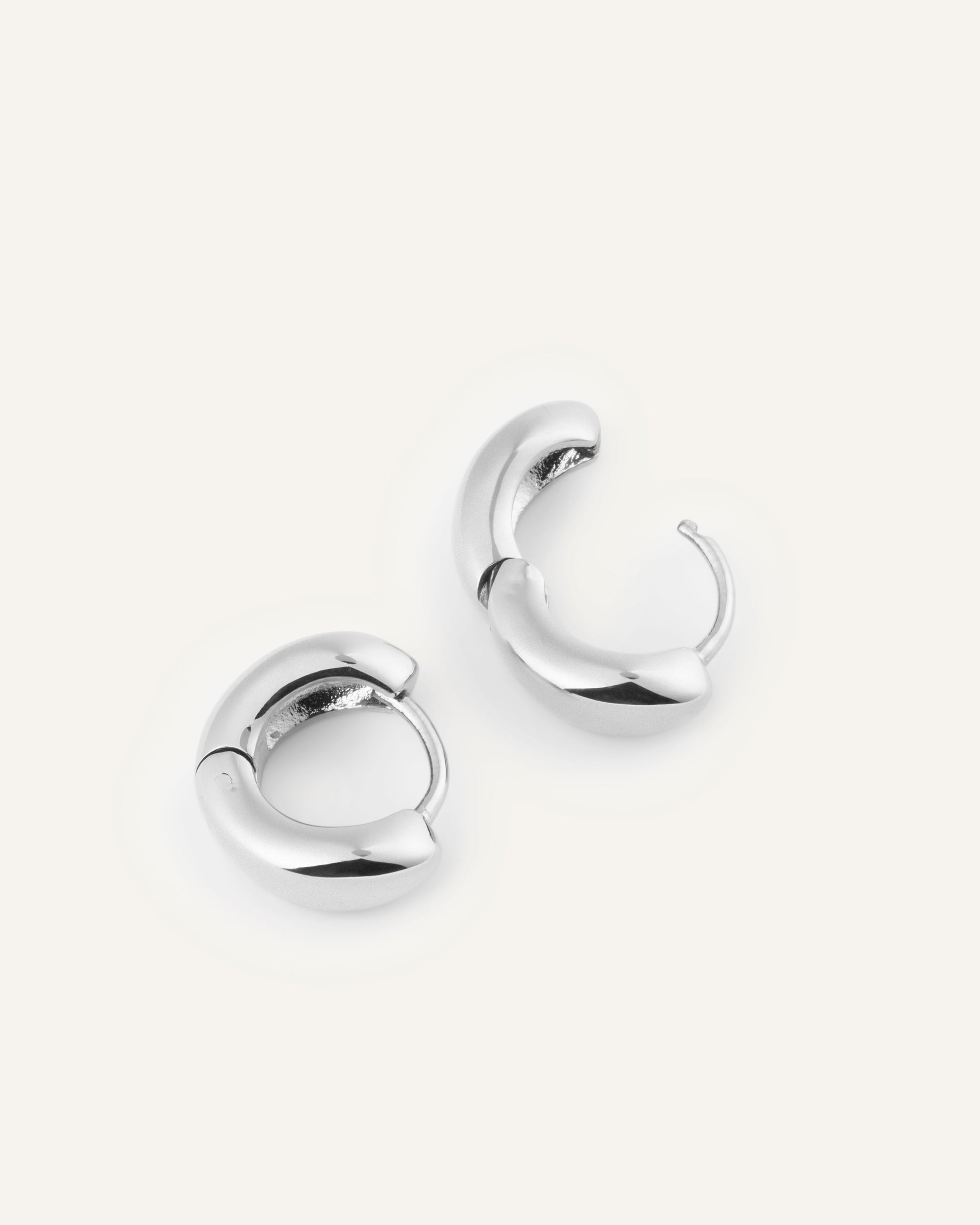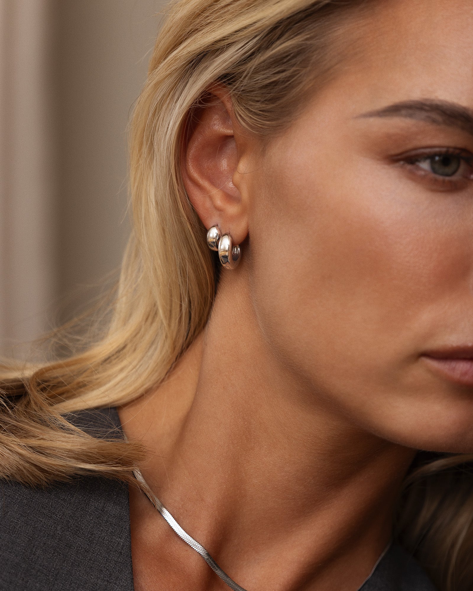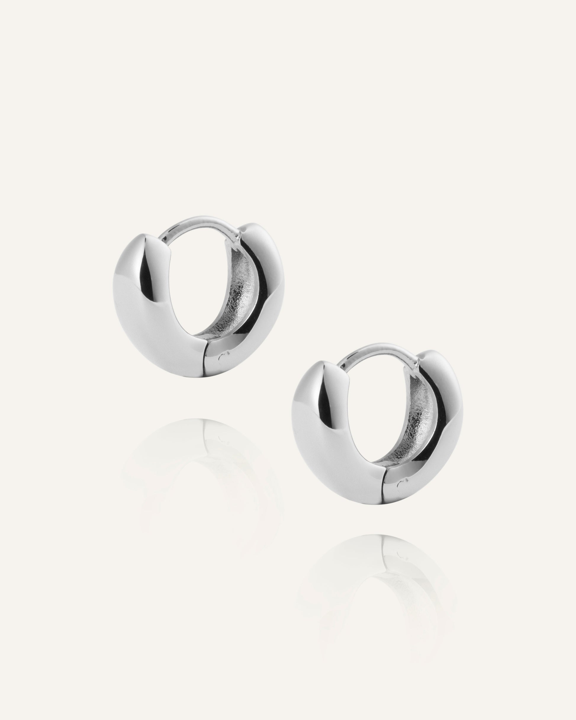 Bulky Huggies in a silver tone feature a polished, domed shape that gives a clean, refined shine. The compact size creates a modern look that works just as well with simple basics as with dressier outfits. Perfect worn solo or paired with other earrings.