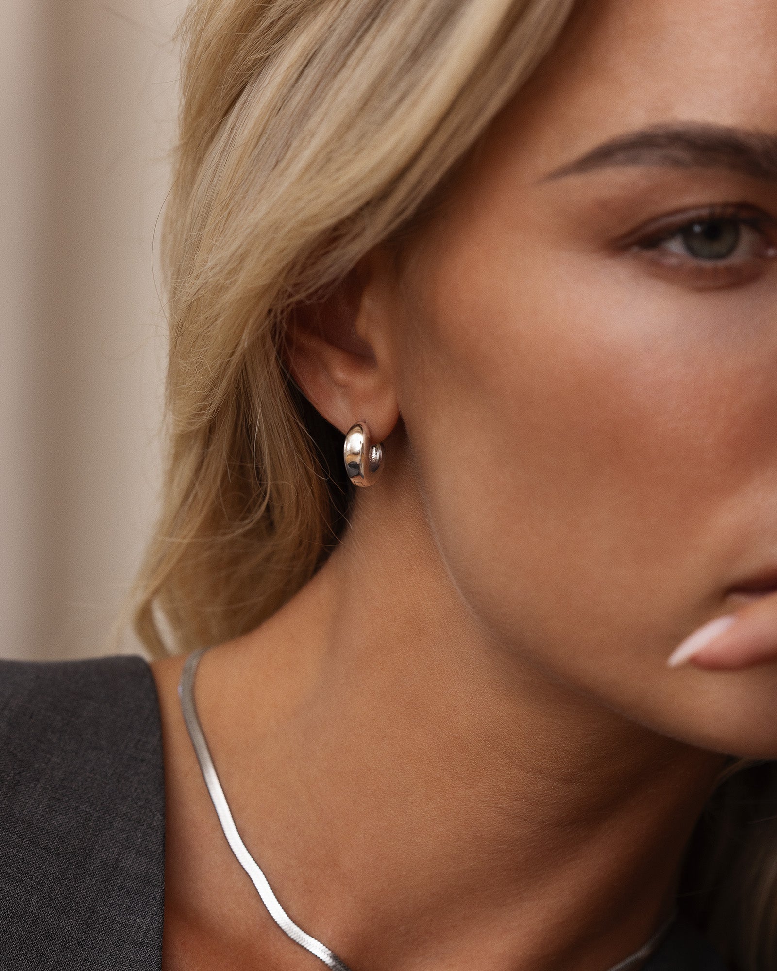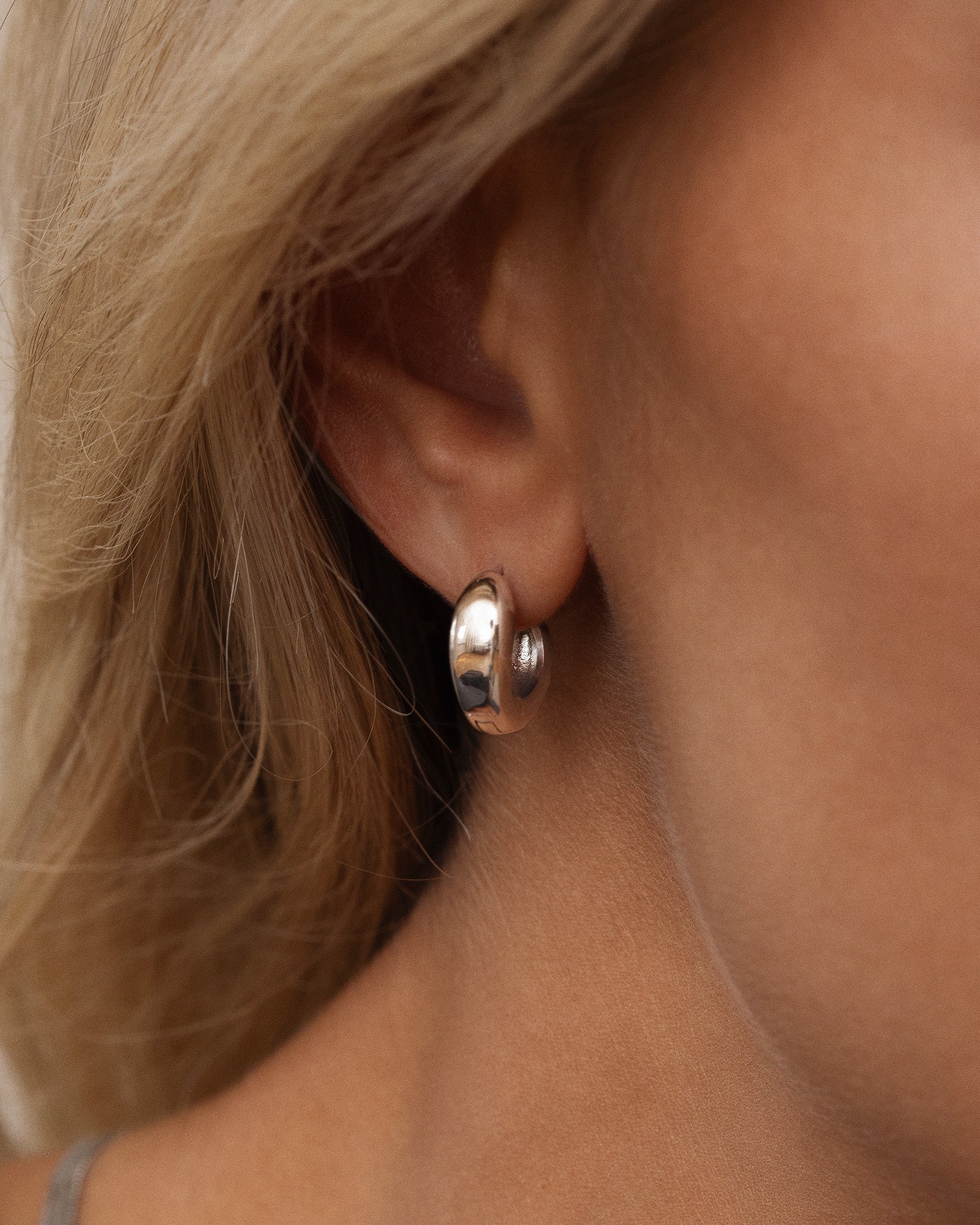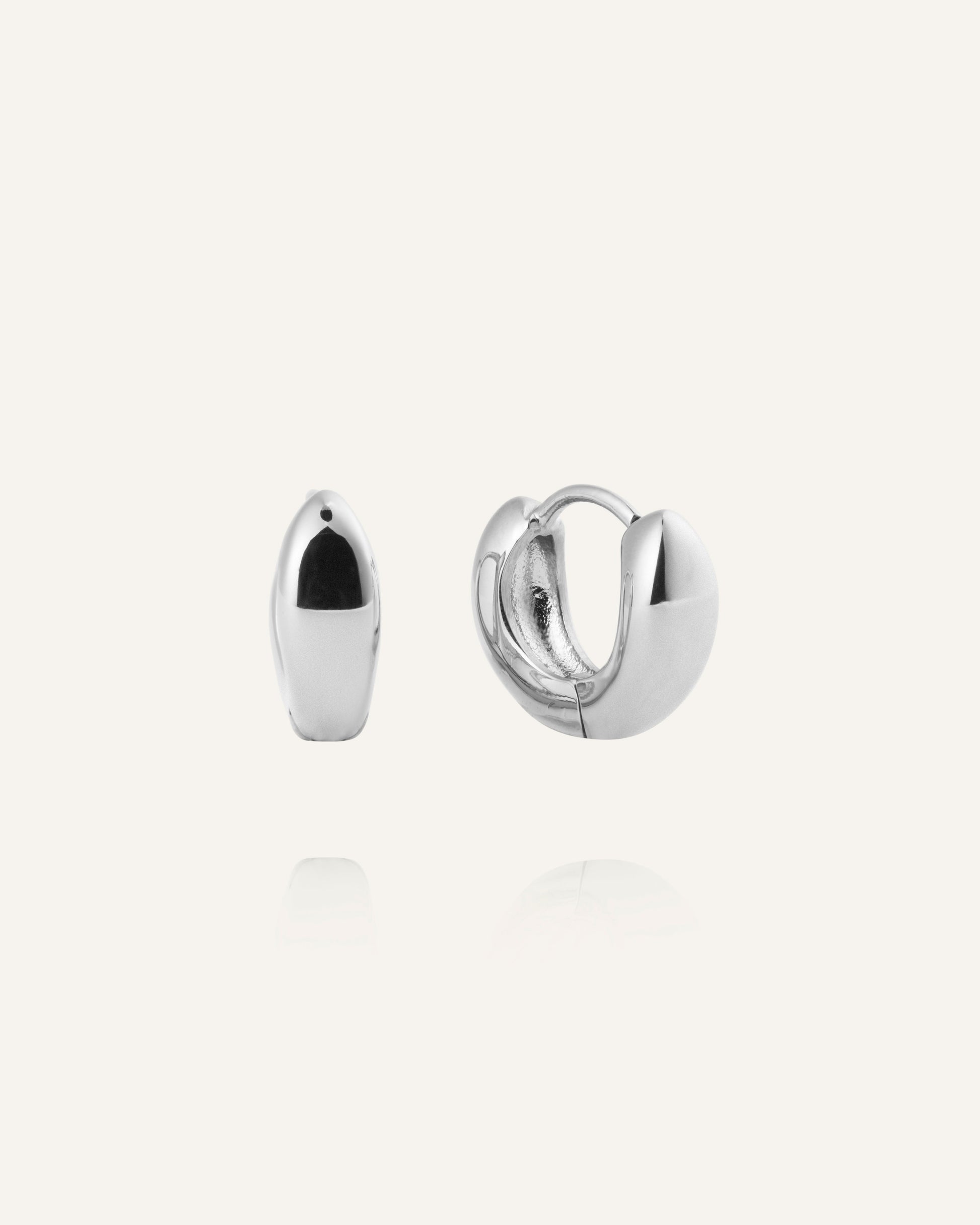Bulky Huggies in a silver tone feature a polished, domed shape that gives a clean, refined shine. The compact size creates a modern look that works just as well with simple basics as with dressier outfits. Perfect worn solo or paired with other earrings.
