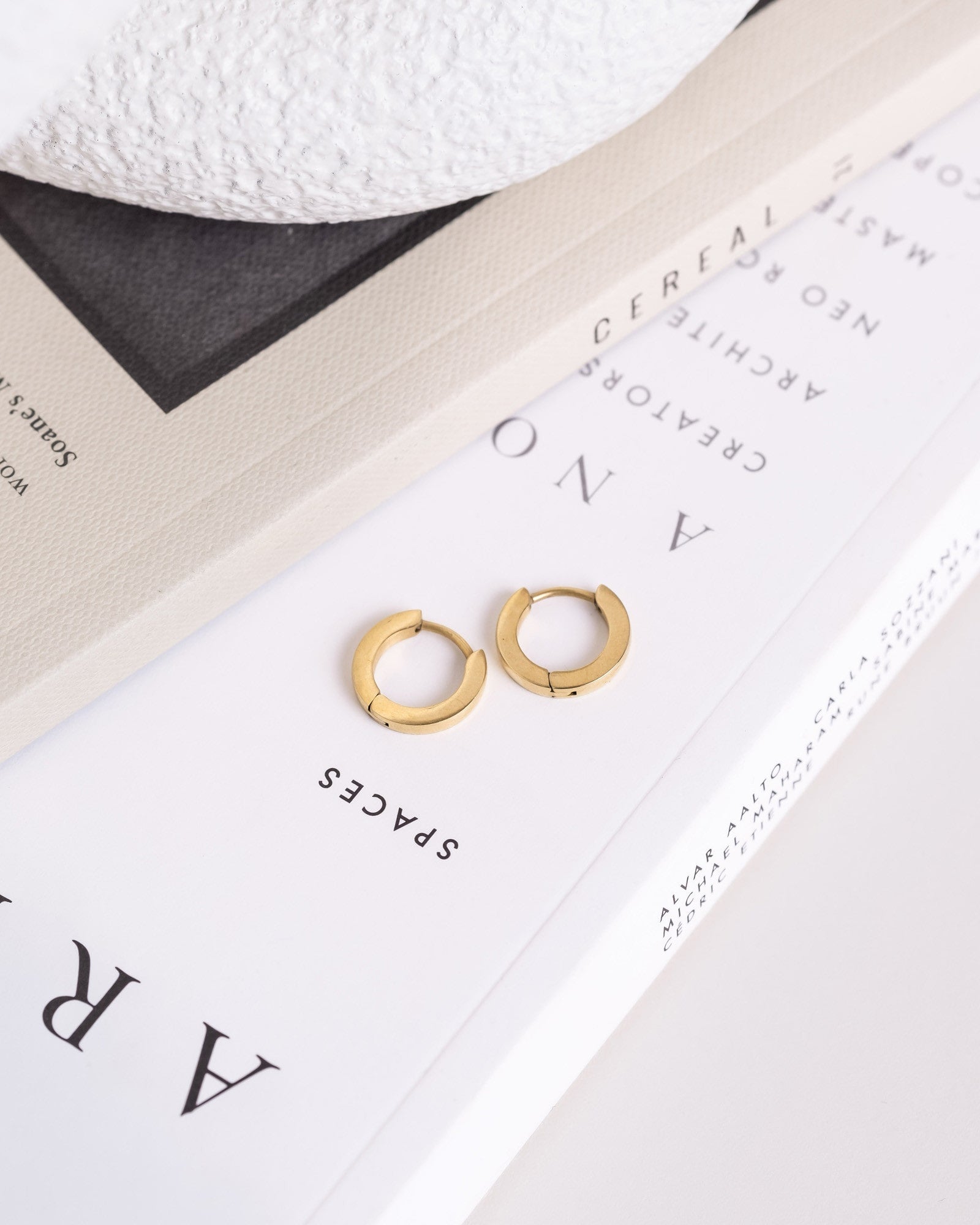 Klassiset korvarenkaat napsautuslukolla, valmistettu massiivisesta ruostumattomasta teräksestä ja pinnoitettu 18K kullanvärisellä PVD-pinnoitteella. Kestävät ja vedenkestävät – nämä korvakorut säilyttävät värinsä ja tyylikkyytensä ajan myötä. Täydelliset yhdistettäväksi Shiny Hoops -korvakoruihimme.