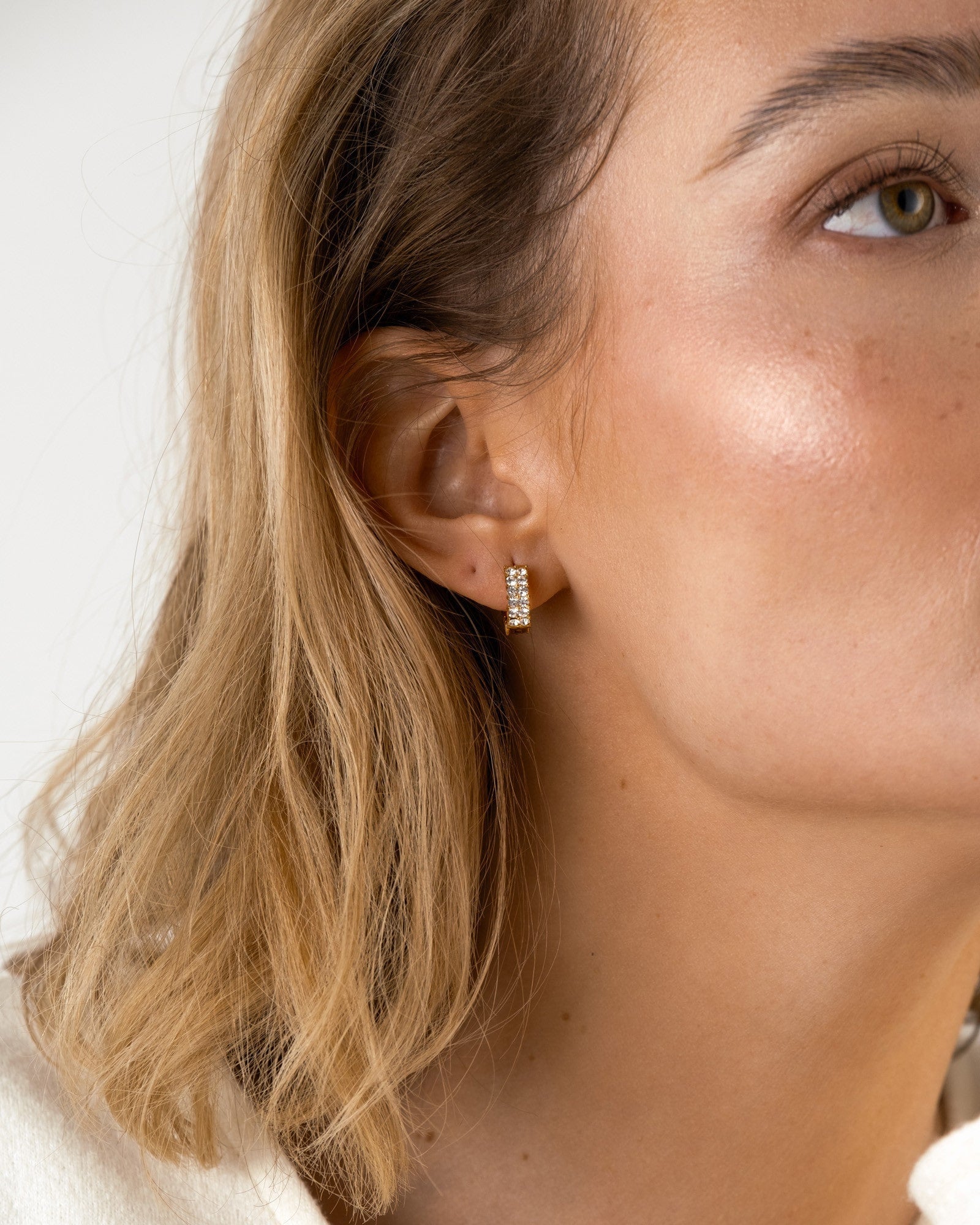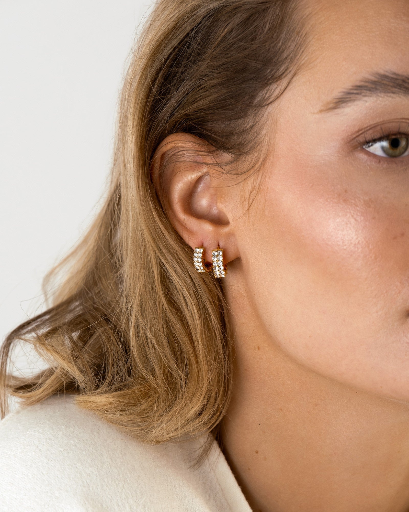 Elegantit renkaat, joissa säihkyvät valkoiset kuutiolliset zirkoniat. Valmistettu massiivisesta ruostumattomasta teräksestä ja pinnoitettu 18K kullanvärisellä PVD-pinnoitteella – kestävät ja vedenkestävät, säilyttävät värinsä ja tyylinsä ajan myötä. Yhdistä ne Midnight-sormuksemme kanssa viimeistellyn kokonaisuuden luomiseksi.