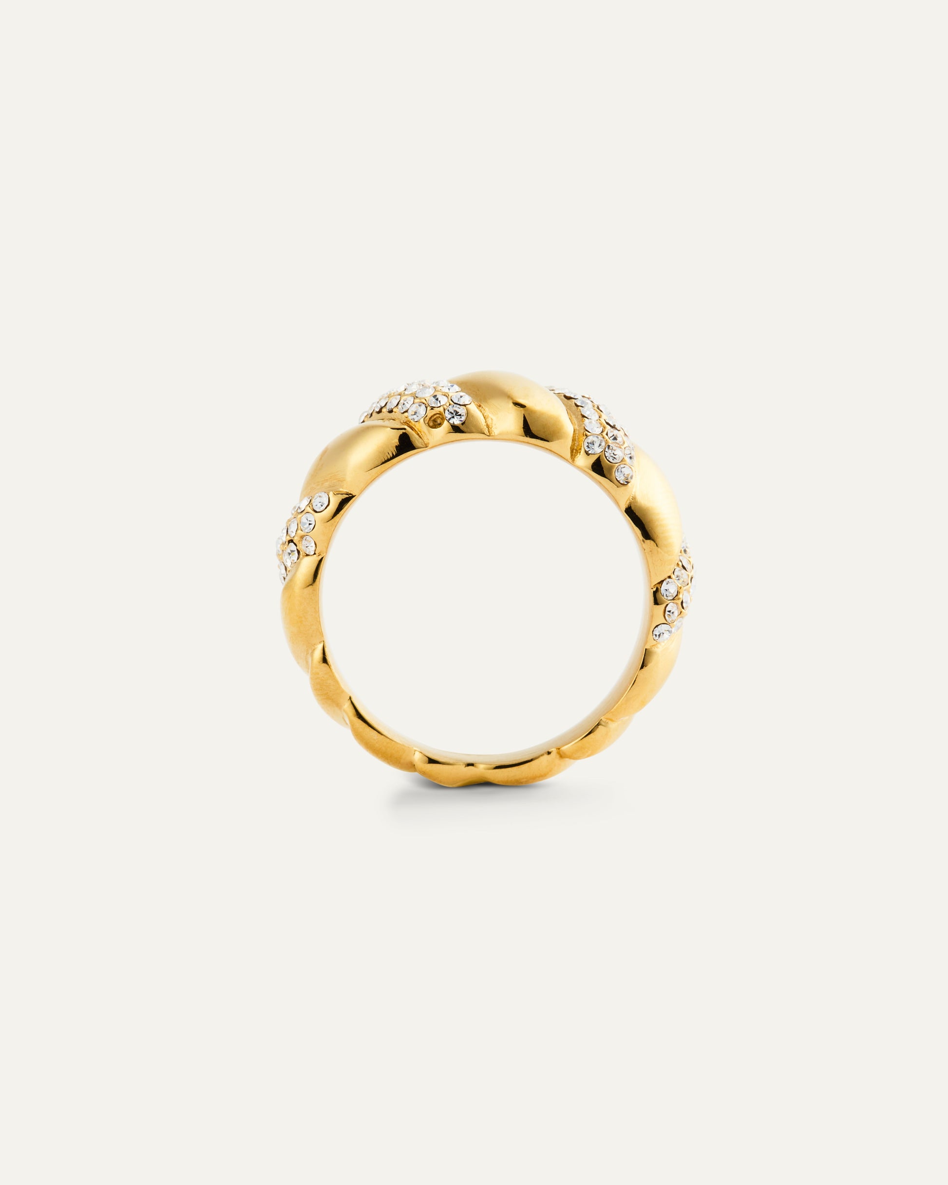 Softly twisted profile where smooth metal meets pavé-set white Preciosa stones – a small statement with warm shine. The gold color creates a distinct yet soft expression that transitions effortlessly from day to night. Wear it solo for a clean line or stacked for extra sparkle.