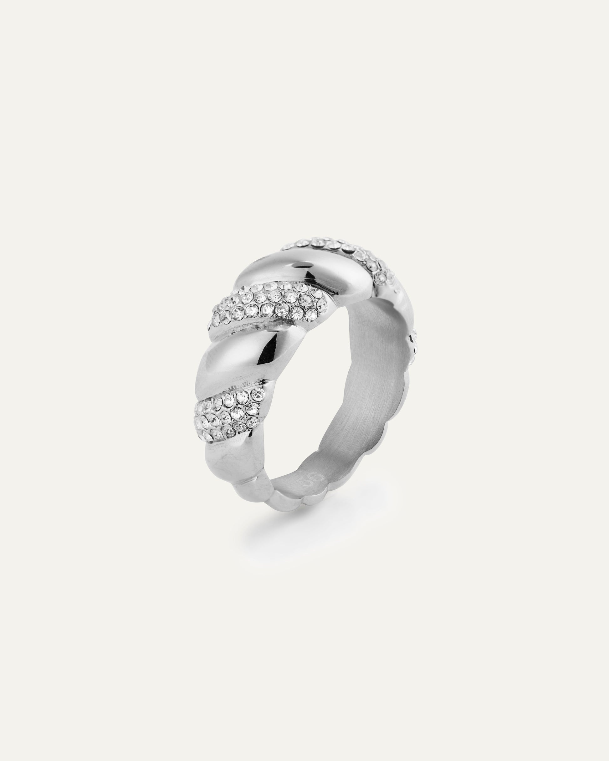 Softly twisted profile where smooth metal meets pavé-set white Preciosa stones – a small statement that feels right every day. The silver finish offers a cool, defined look and pairs easily with your favorite pieces. Wear it solo for a clean line or stacked for extra shine.