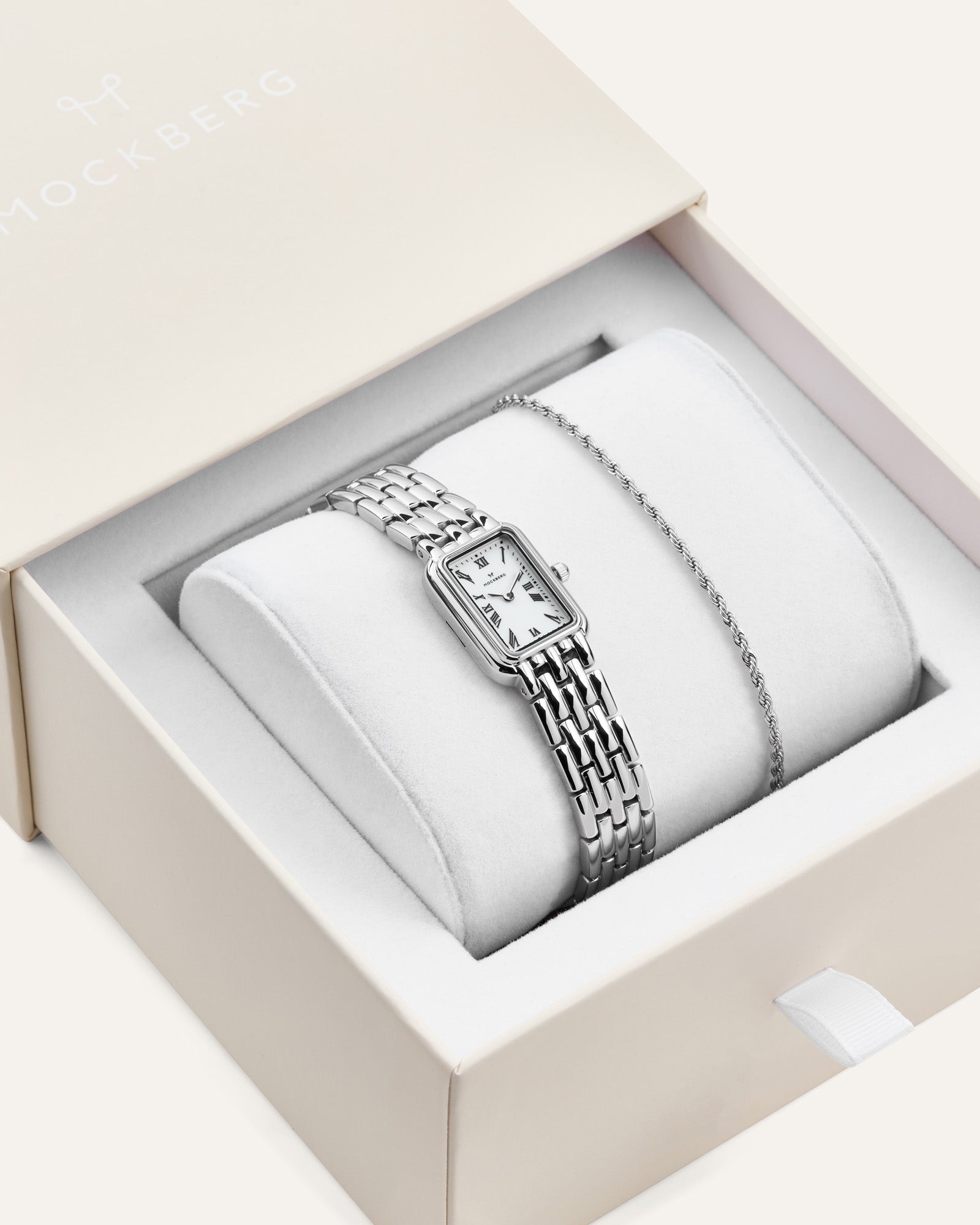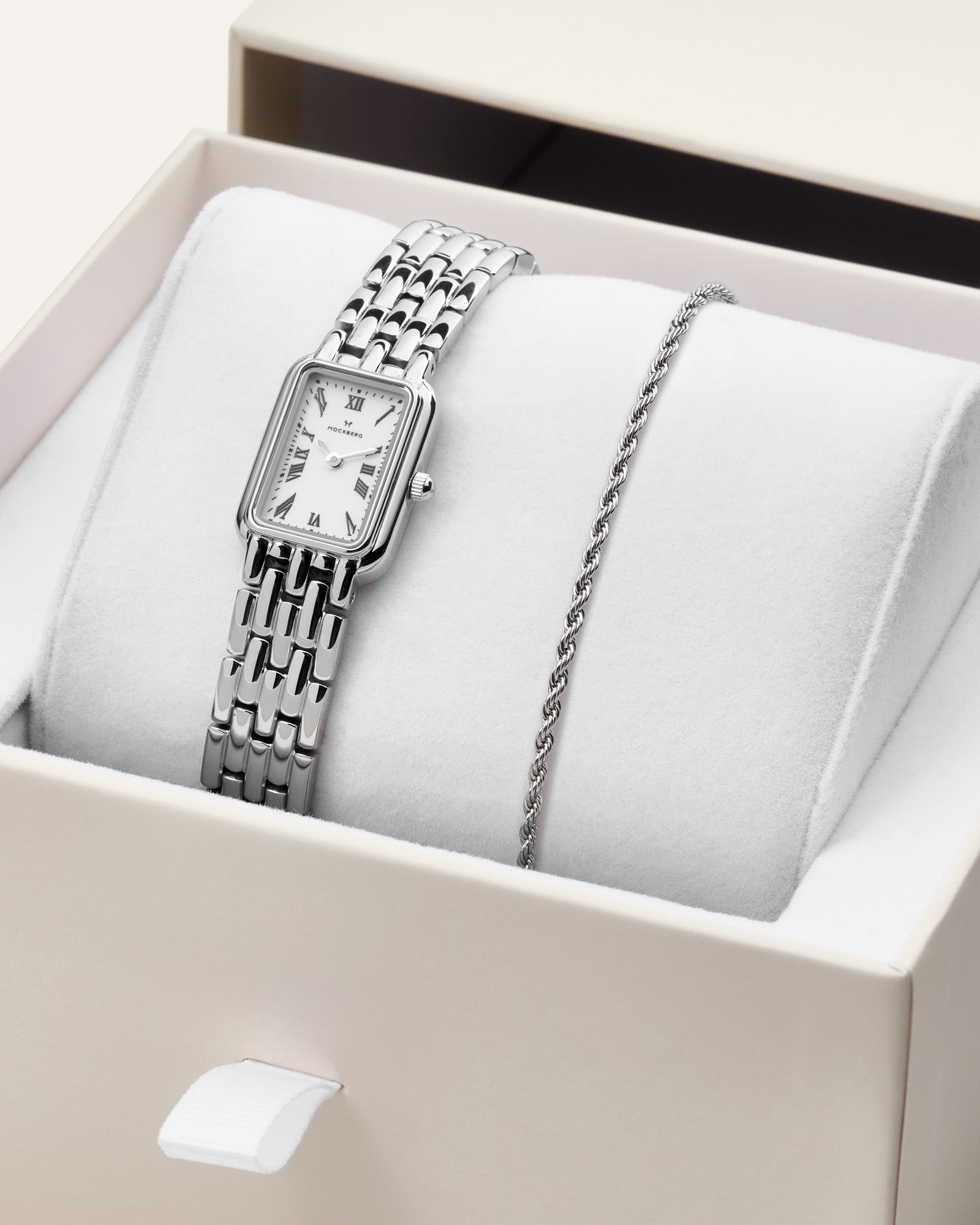 Kaunis lahjarasia, joka sisältää Renaissance-rannekellon ja Thin Rope -rannekorun. Yhdistelmä luo täydellisen klassisen tyylin, joka sopii sekä arkeen että juhlaan. Kello ja koru toimitetaan rasiassa – täydellinen lahja tärkeälle ihmiselle!