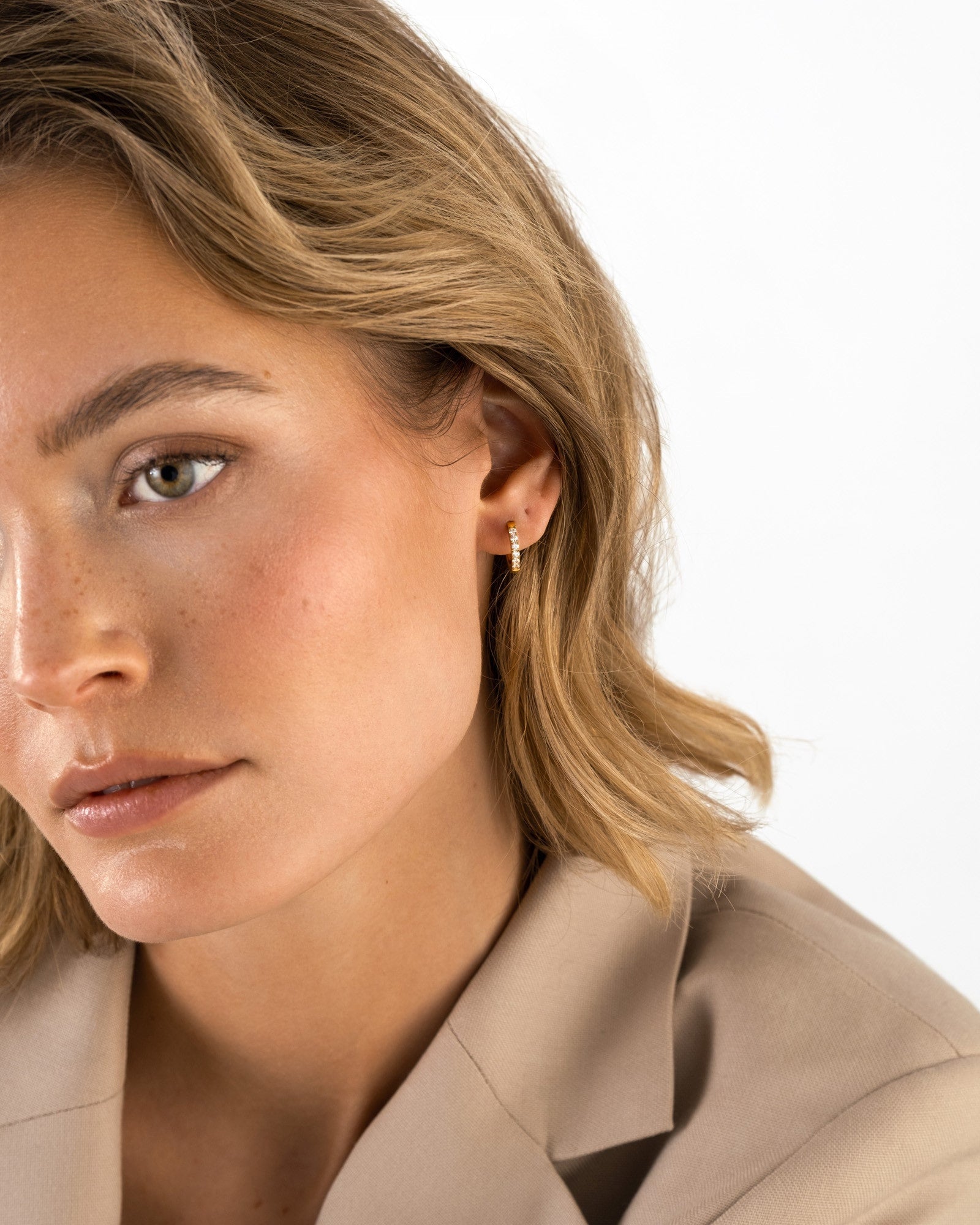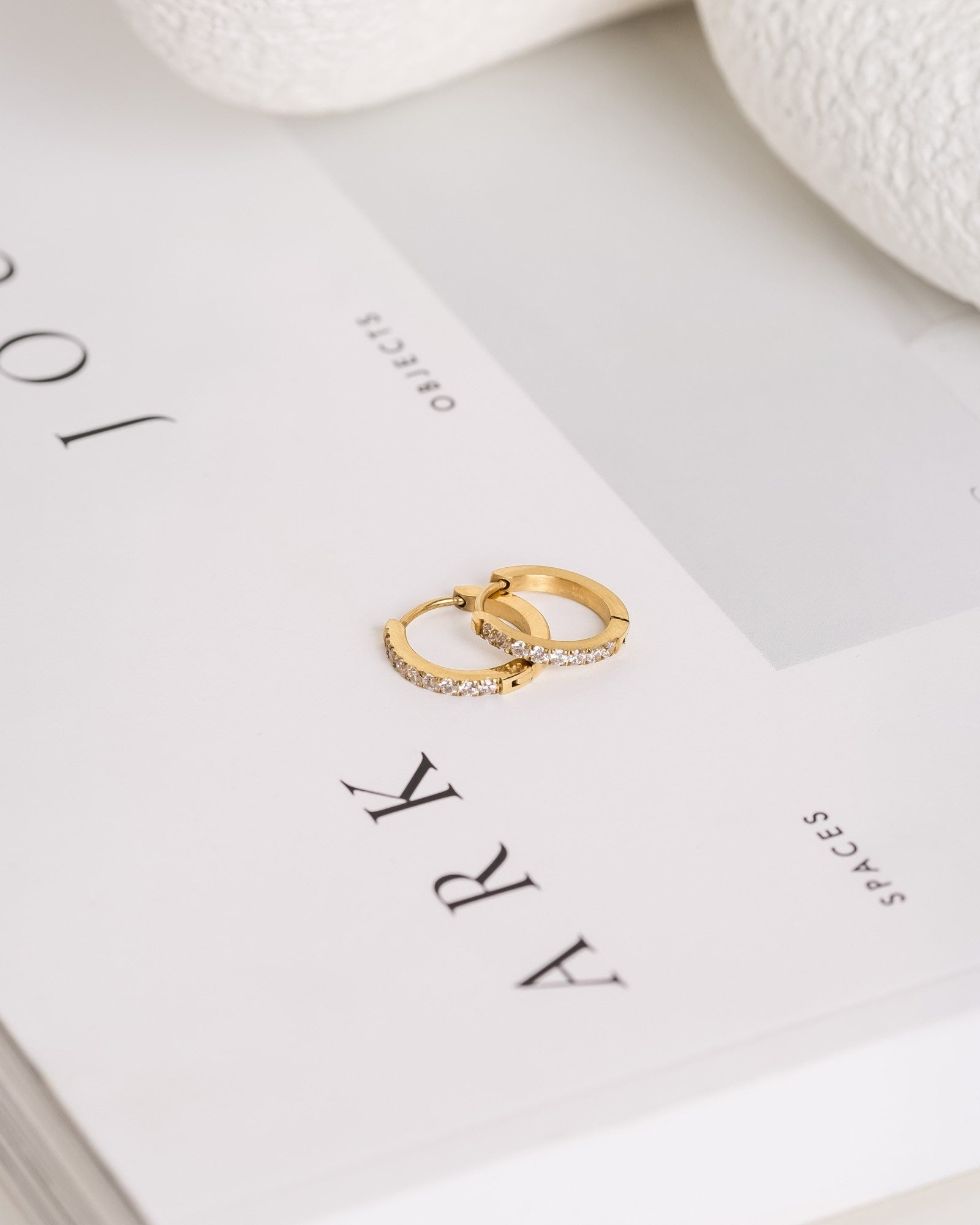 Ajattomat renkaat, joissa on valkoisia zirkonikiviä. Valmistettu massiivisesta ruostumattomasta teräksestä ja päällystetty 18K kullanvärisellä PVD-pinnoitteella. Kestävät ja vedenkestävät – säilyttävät värinsä ja elegantin ilmeensä ajan myötä. Täydelliset yhdistettäväksi Classic Hoops -korvakoruihimme.