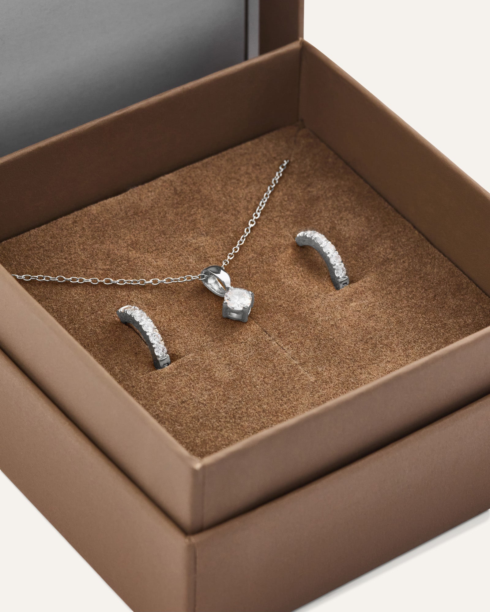 Tyylikäs setti, jossa on kaulakoru ja suosituimmat korvakorumme. Suunniteltu luomaan ajaton ja klassinen ilme. Täydellinen lahja rakkaalle – tai itsellesi.